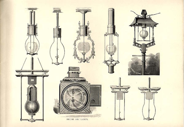By the early 1880s, arc lamps were lighting public squares and large interiors, while incandescent bulbs spread through offices and homes.