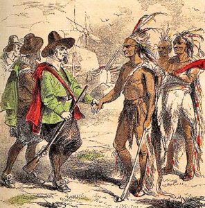 Although they constantly dreaded attacks from the Indians, it was nearly three months before an Abenaki Indian showed himself at the settlement. Then, one day in March, a dusky stranger was seen coming down the village’s street. His first words were: Welcome, Englishmen. This was Sam-o-set. Where do you suppose he learned those English words? A week later, he returned with a friend named Squanto.